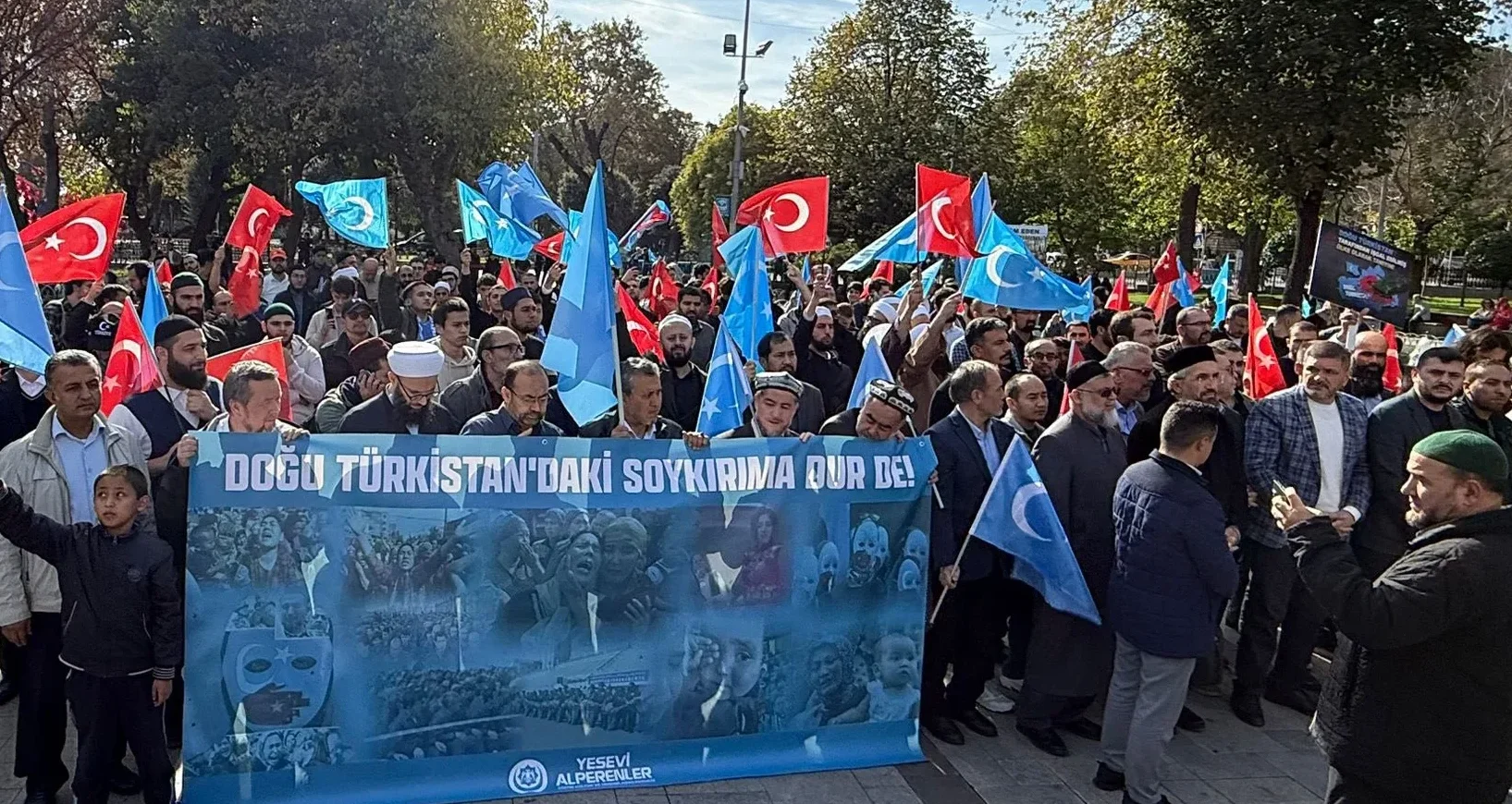 A large-scale demonstration took place on October 26, 2025, at Saraçhane Park in Istanbul to protest China’s ongoing systematic genocide policies targeting the people of East Turkistan (Xinjiang Uyghur Autonomous Region in China). The event was organized under the leadership of the Platform of Uyghur Organizations in Turkey and its affiliated Federation of East Turkistan Associations, in cooperation with more than 30 non-governmental organizations, including the Platform for Unity of Thought and Struggle and the Yesevi Alperenler Hearth.
